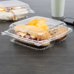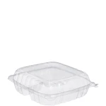 Easily identify food with this clear plastic container. Snap in sandwiches, salads or frozen desserts. Create clean and stylish displays with this 8.8 x 9.3-inch square design. Cut down on spills with the leak-resistant seal on the 8.8 x 9.3-inch clear plastic hinged containers. Be confident your food is ready for delivery with the audible snap feature. Proudly display food selections at cafes, delis and bakeries thanks to the clear design.